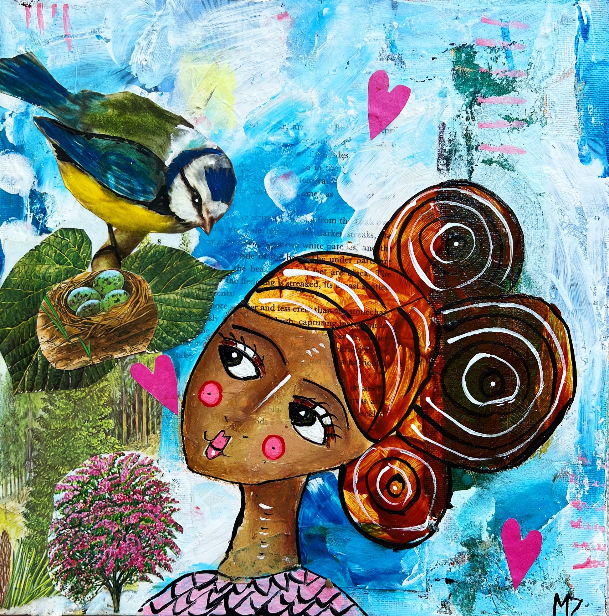 A beautiful print of a woman communicating with a Blue Tit. Part of my woman and bird series. I like to think that all of us have a special bird.