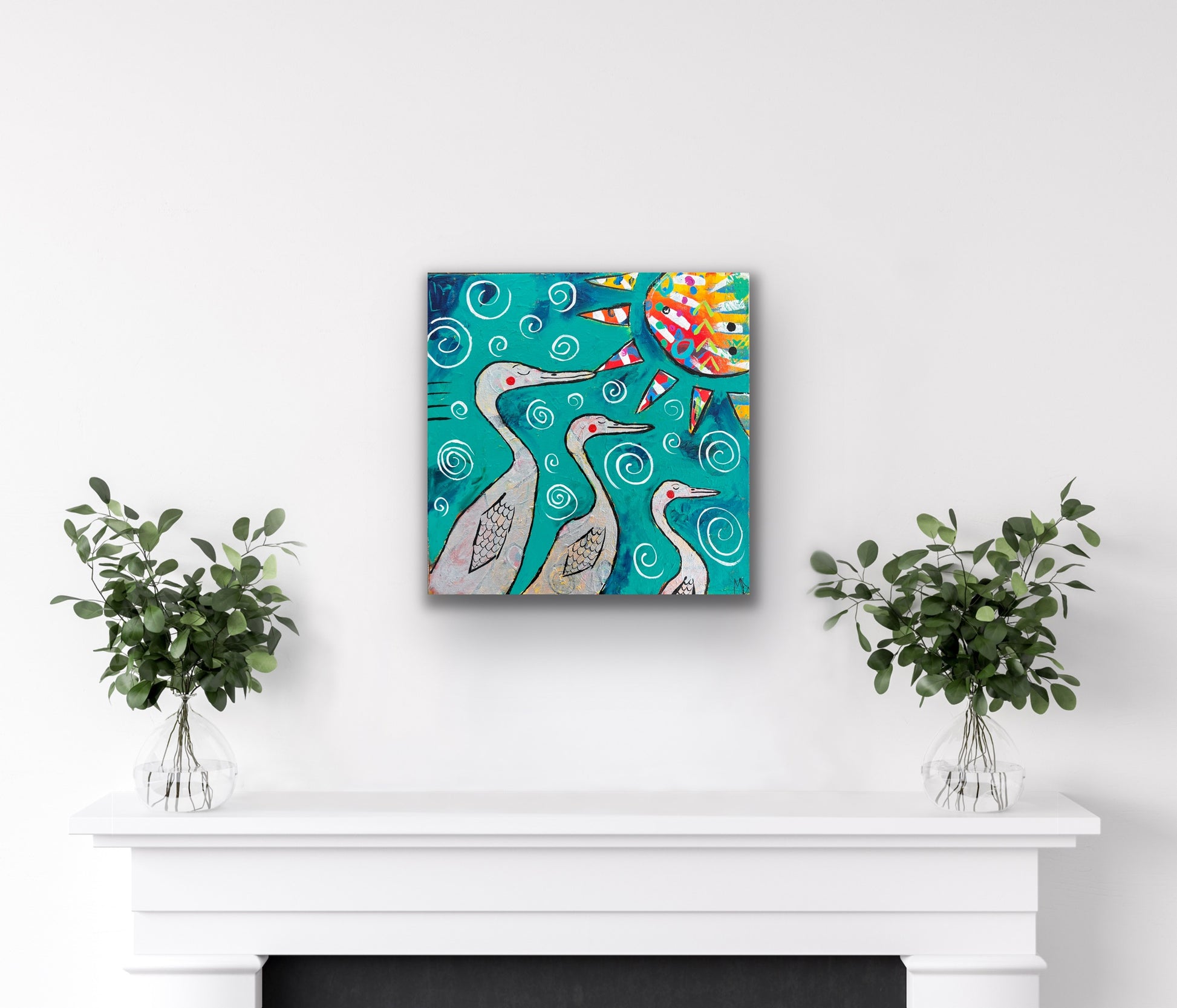 This humorous painting depicts three herons strutting their stuff under a blazingly bright sun.