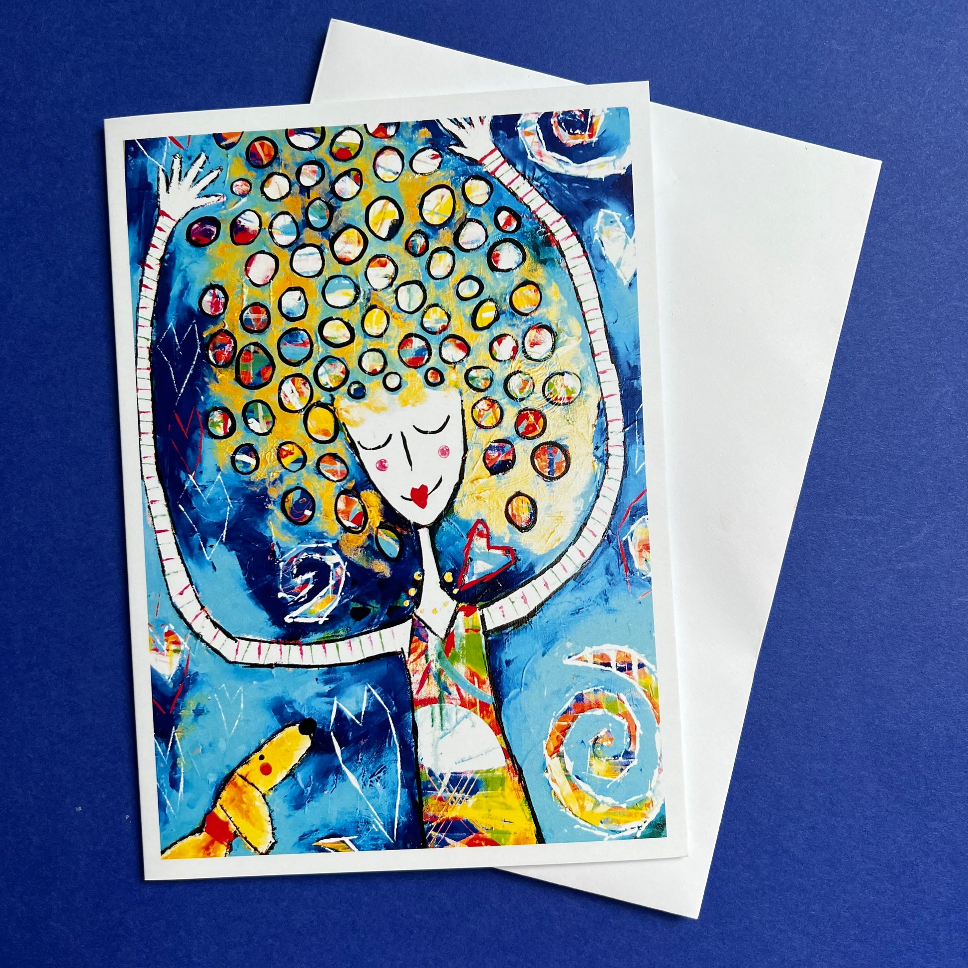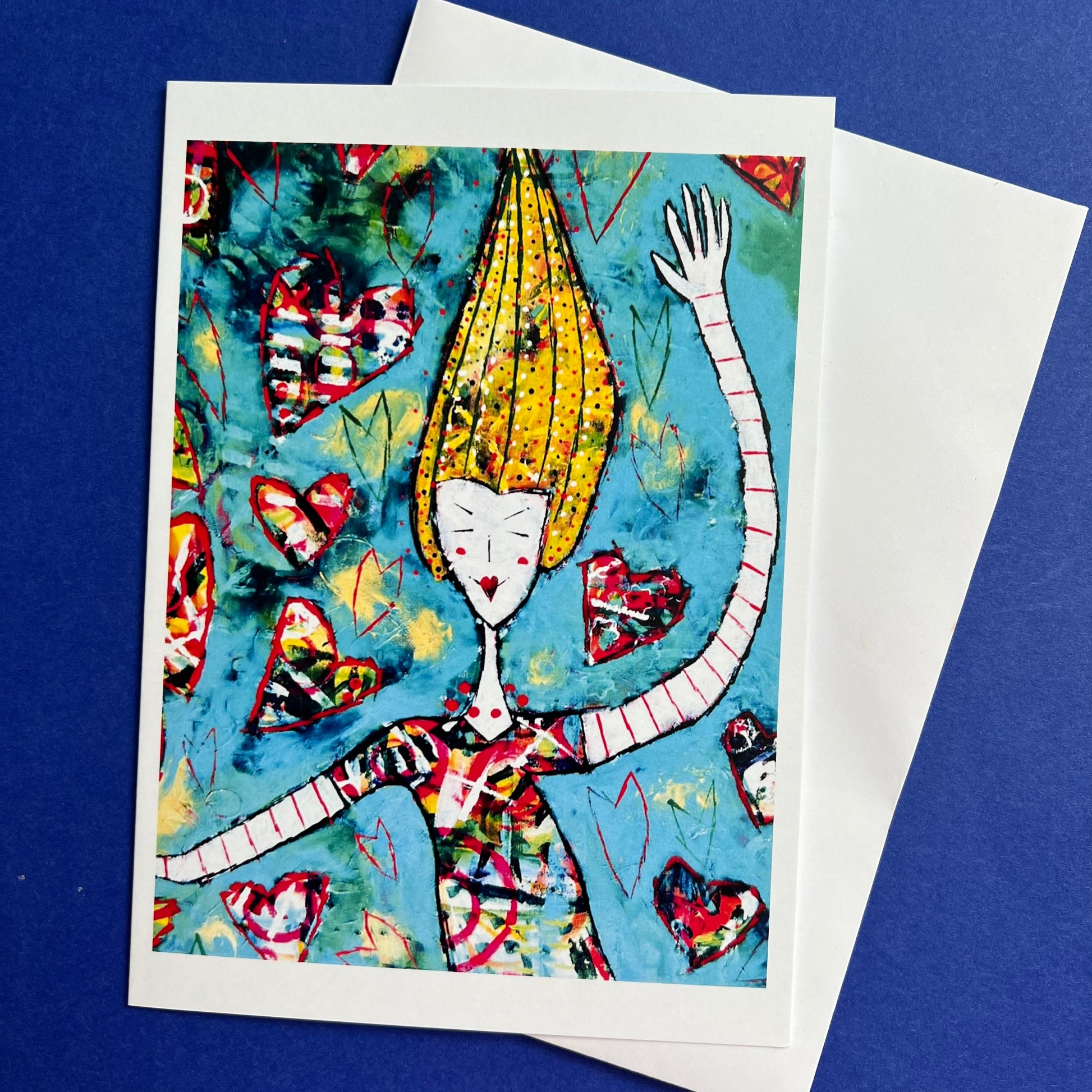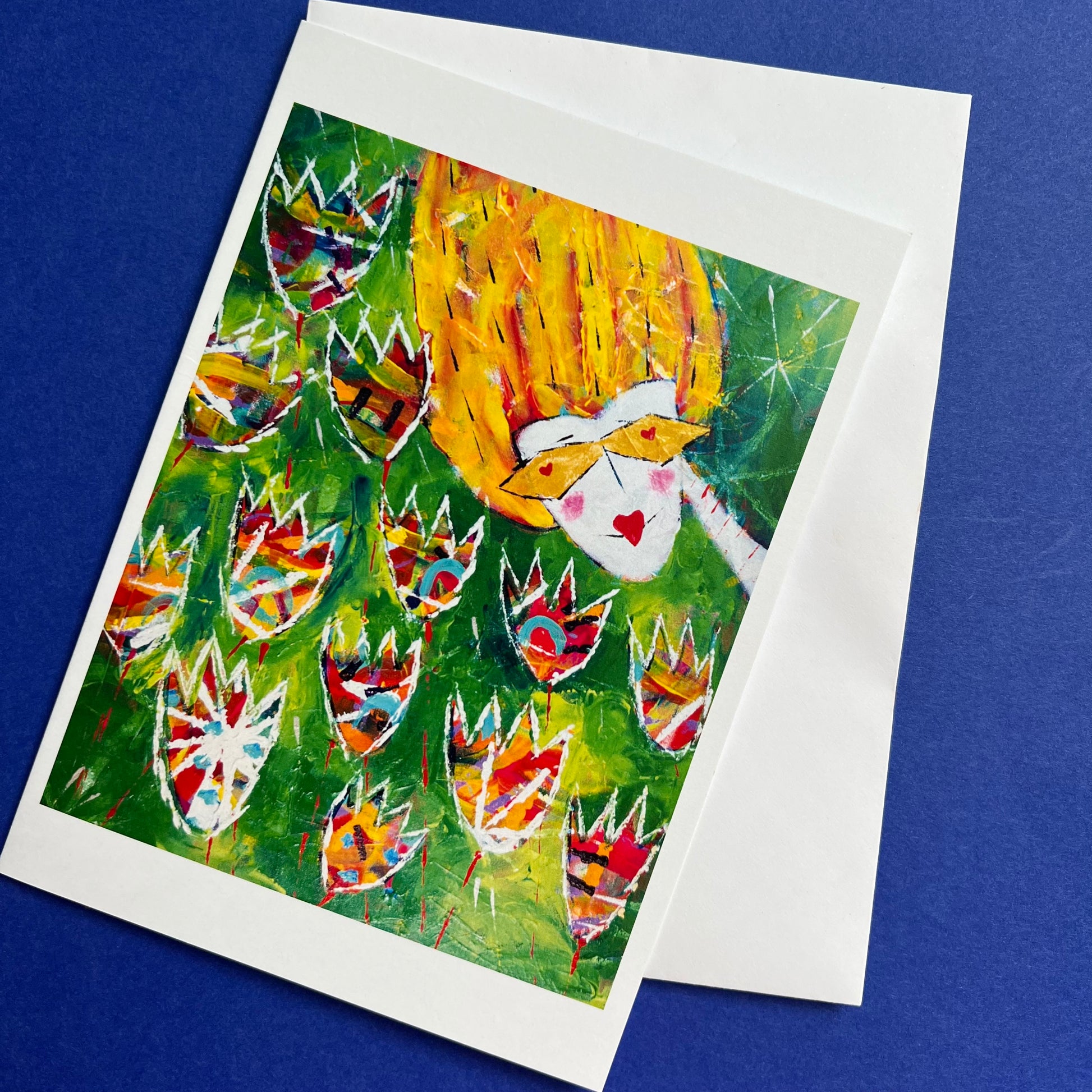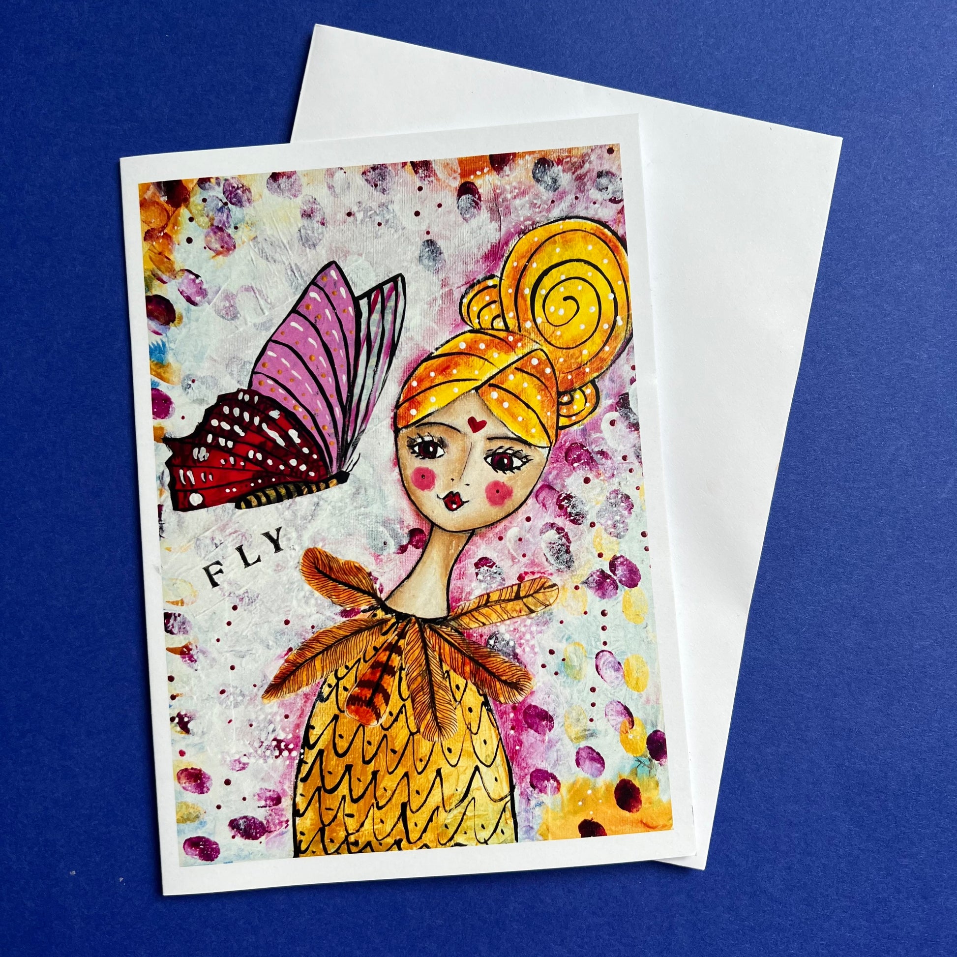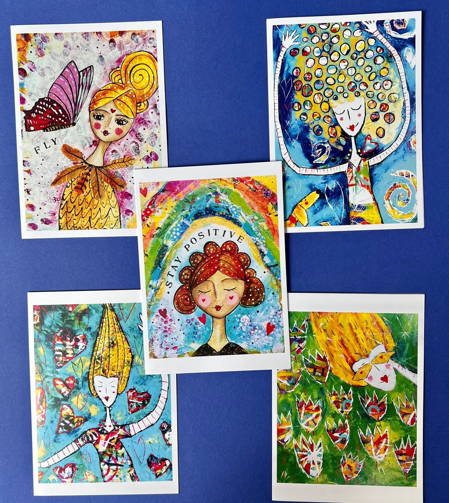 An uplifting collection of 5 different blank greeting cards, each with a positive vibe. ‘Bliss’, ‘Love Dance’, ‘Stay Positive’, ‘Fly’ and ‘Flower Dazzle’.
