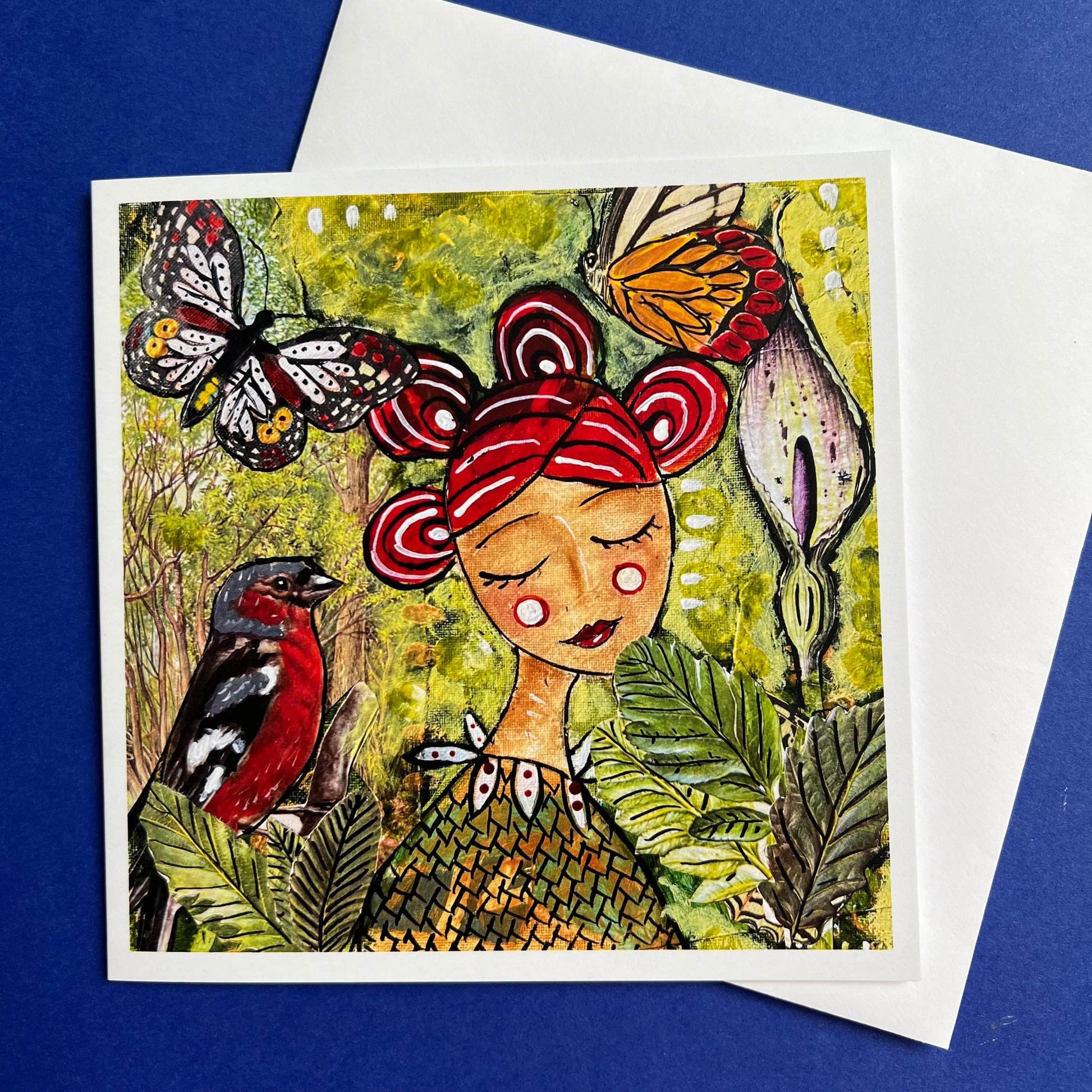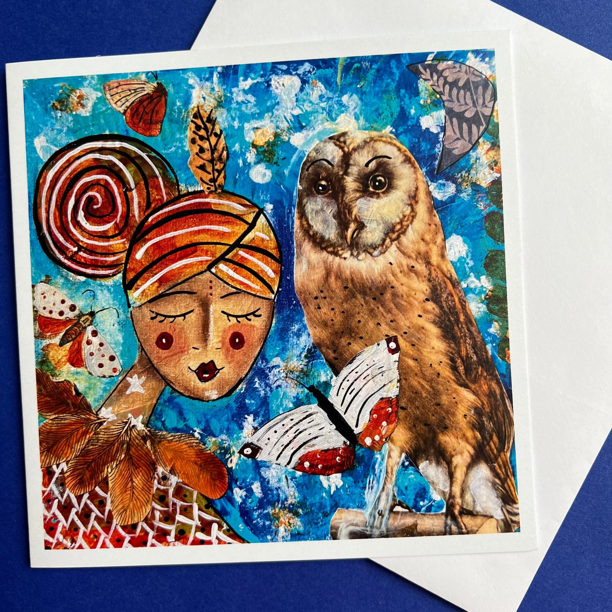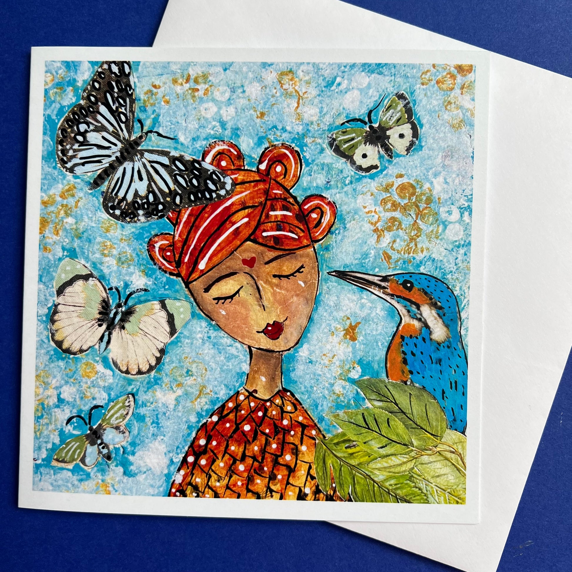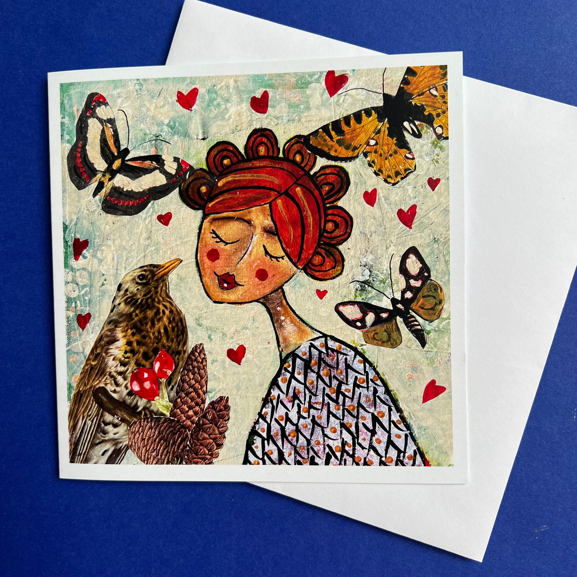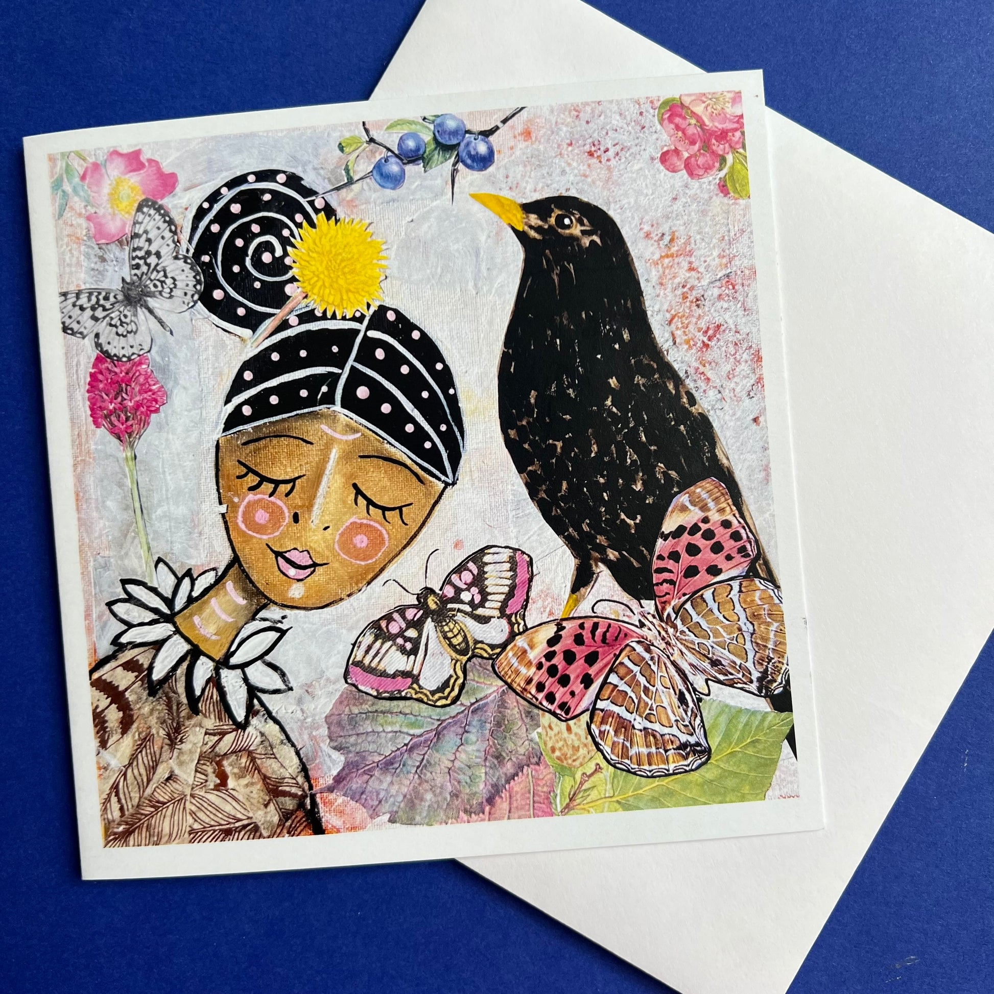 A beautiful collection of 5 different blank greeting cards each featuring a woman with a bird: Chaffinch, Fieldfare, Blackbird, Kingfisher and Owl.