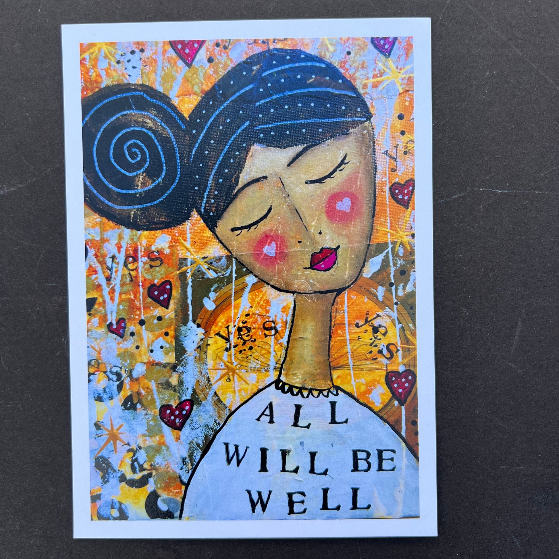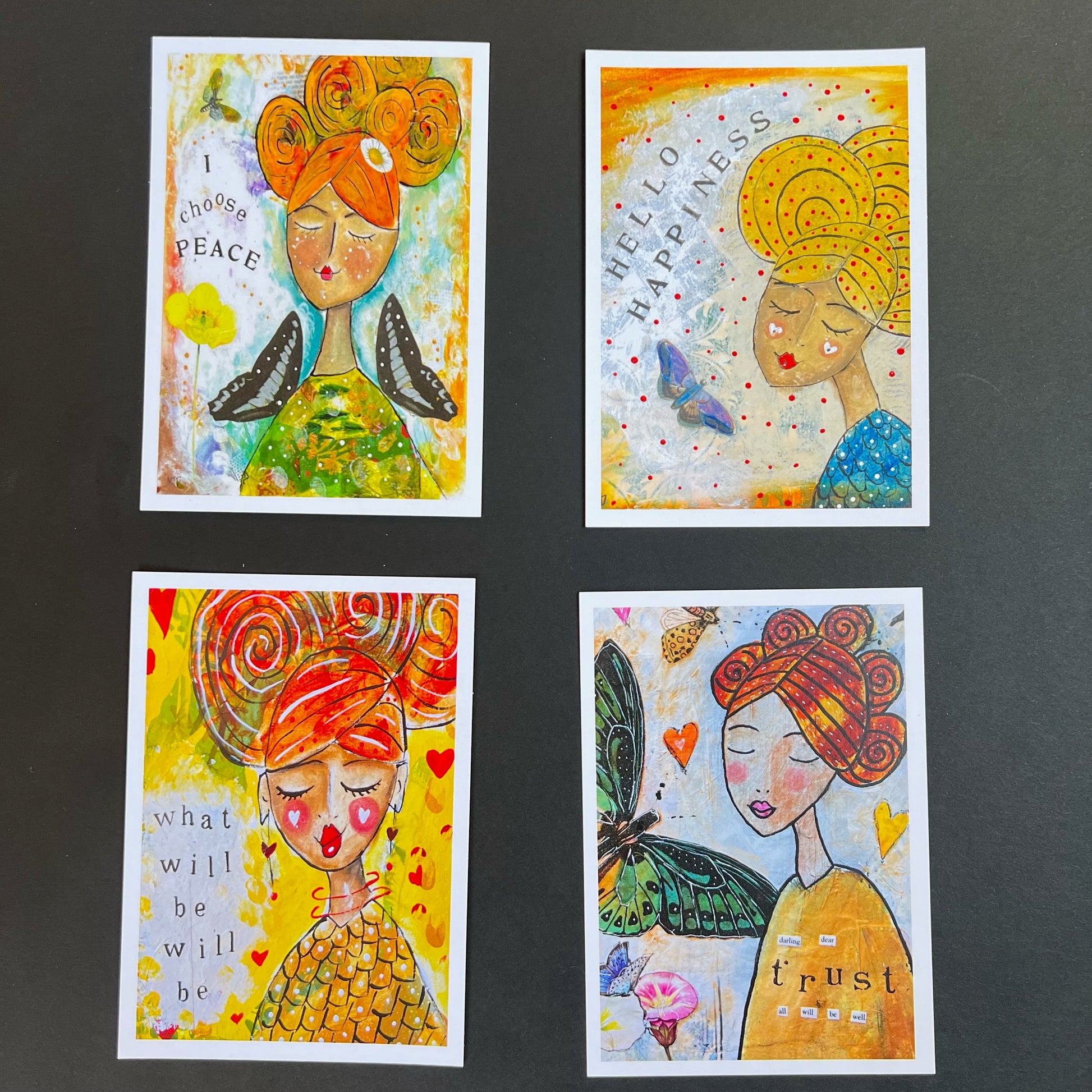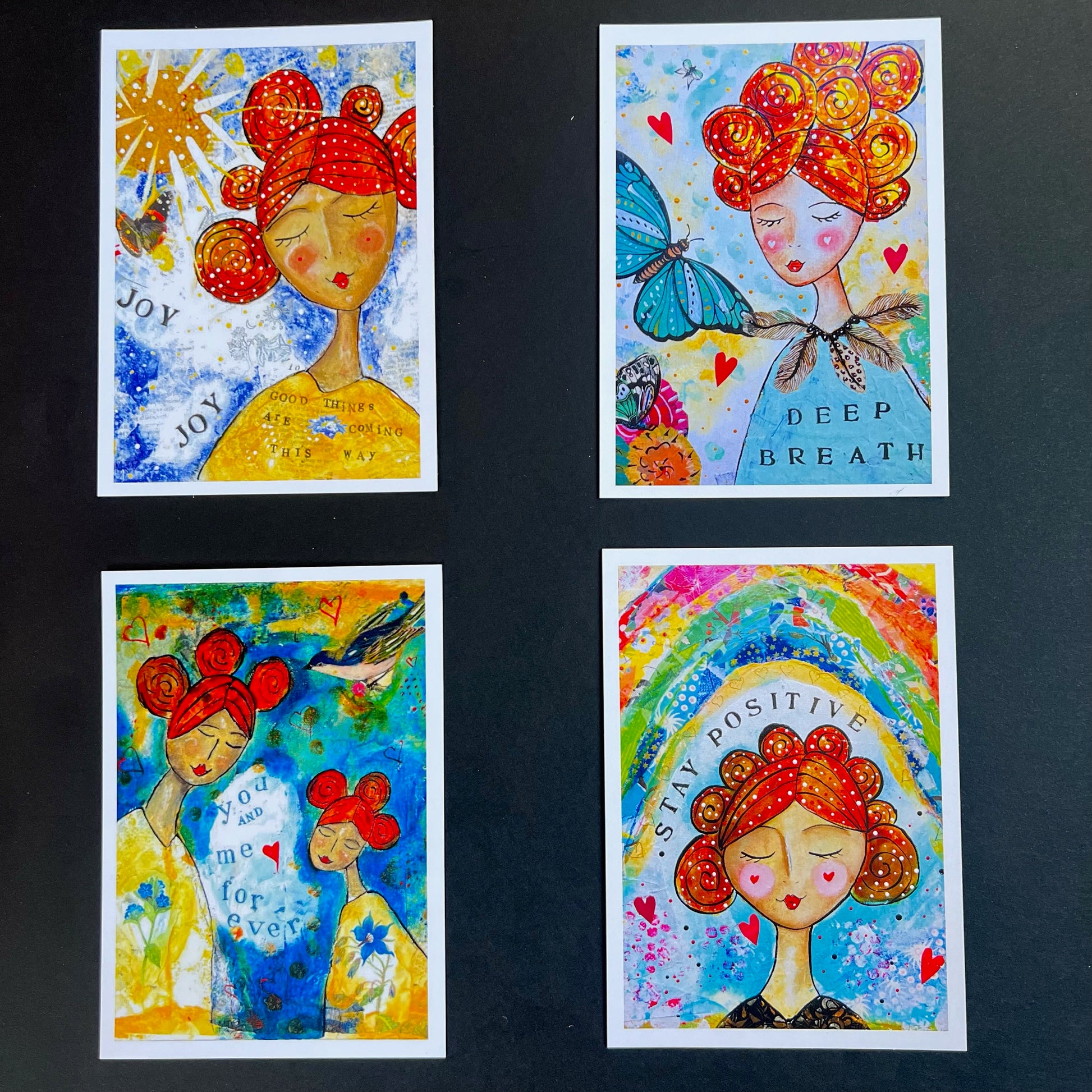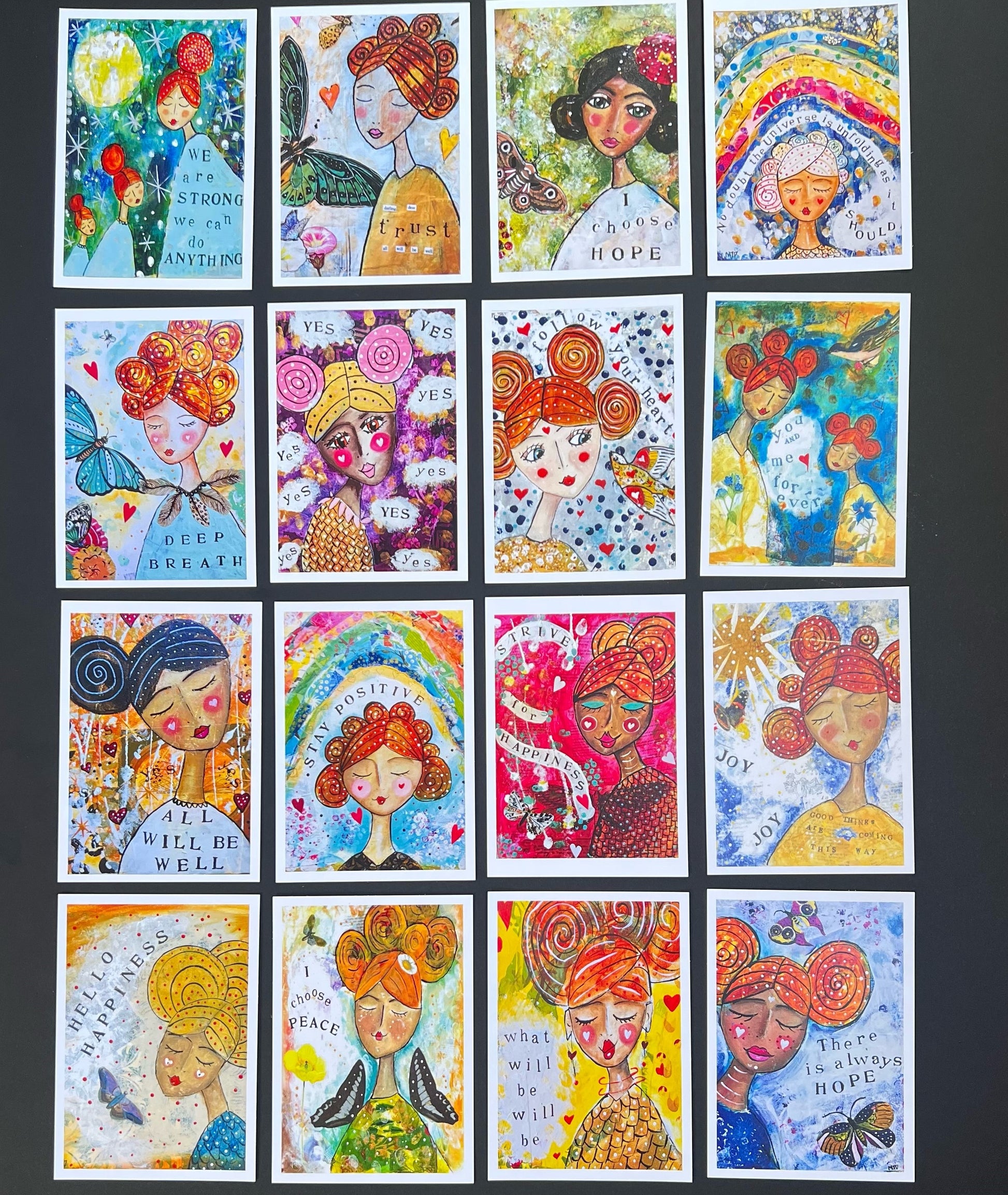 All 16 of my uplifting Positive Postcards. Designed to send or to hang up at home, use as an affirmation pack or (like I do) use as affirming, joyful bookmarks! Lovely to have around your home to boost your mood, and give away to spread the smiles.